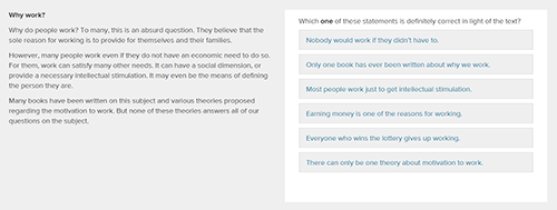 The Elements Verbal test consists of 15 questions based on passages of text. The passages are presented on the left-hand side of the screen and questions on the right. Below each question you are presented with a range of possible answers from which to choose. Sometimes you have to choose two answers and sometimes only one; it will always be clear whether you have to make one or two choices. There is no overall time limit for the test but there is a time limit for each question: 75 seconds for the first question on each passage of text and 60 seconds for subsequent questions.
